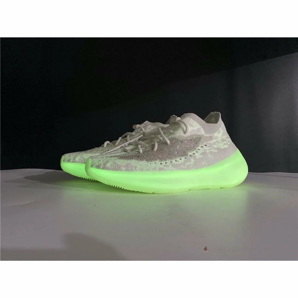 The glow-in-the-dark sneakers began with the Adidas Yeezy Boost 380 Calcite Glow. Its name, Calcite, means cream-colored white Primeknit upper with additional blue highlights. Thus, Adidas Yeezy Boost 380 Calcite Glow is perfect for its clean white textured Primeknit upper with a neon green/yellow glow in the dark. The effects happen when the sneakers are exposed to light in the dark. Besides its amazing glow, it also introduces airflow on the foot for better shoe comfort and performance. Furthermore, the sneakers own the iconic Boost cushioning technology in its semi-translucent midsoles.