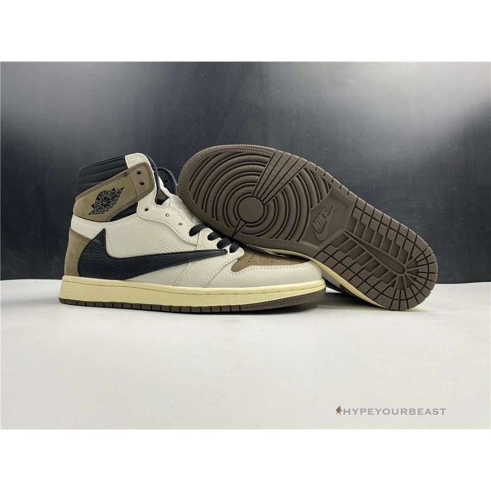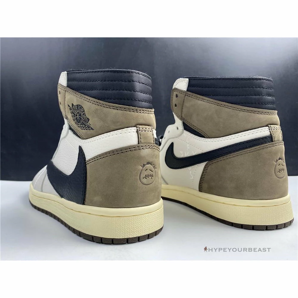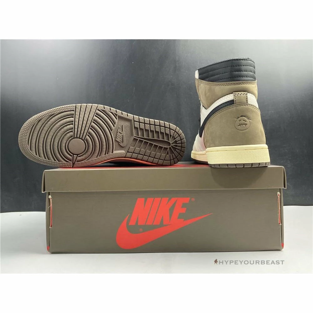 Air Jordan 1 High Travis Scott Reverse is inspired by its original Travis Scott x Air Jordan 1 Retro High kicks. Both these shoes are built by the famous Jordan brand and popular rapper Travis Scott. These sneakers carry white leather construction with dark mocha accenting on the heels and ankle collars. It also brings out a black backdrop holding the collars as well as a black reversed Nike Swoosh. The most unique thing about these Air Jordan 1 High Travis Scott Reverse is its sail eyelets, different from other kicks designed by Travis Scott x Air Jordan. The sneakers are completed with sail midsoles and black rubber outsoles.