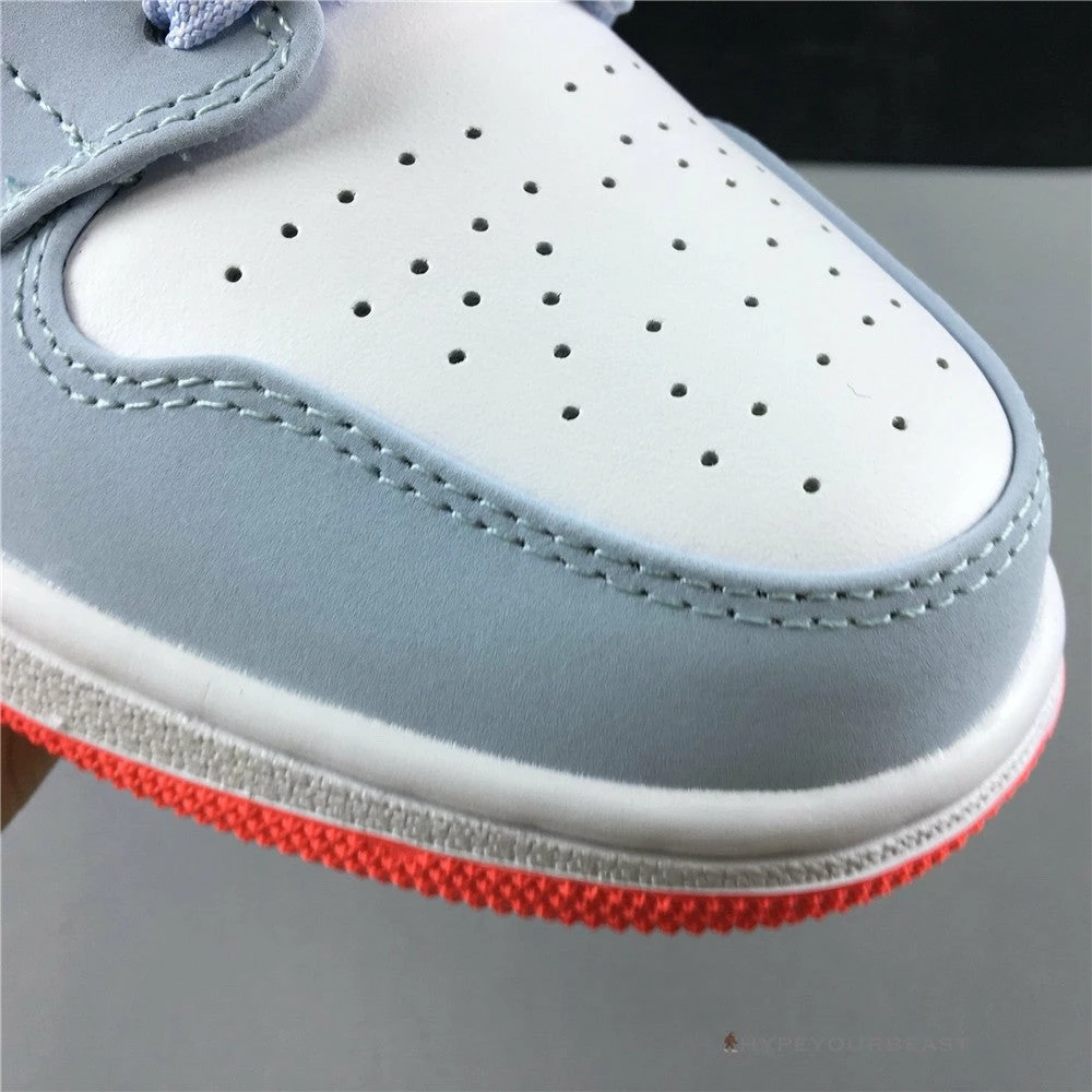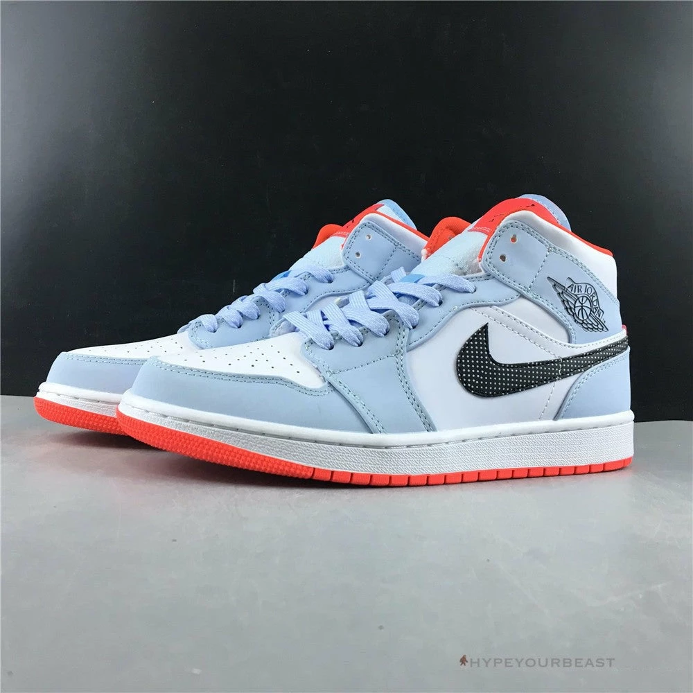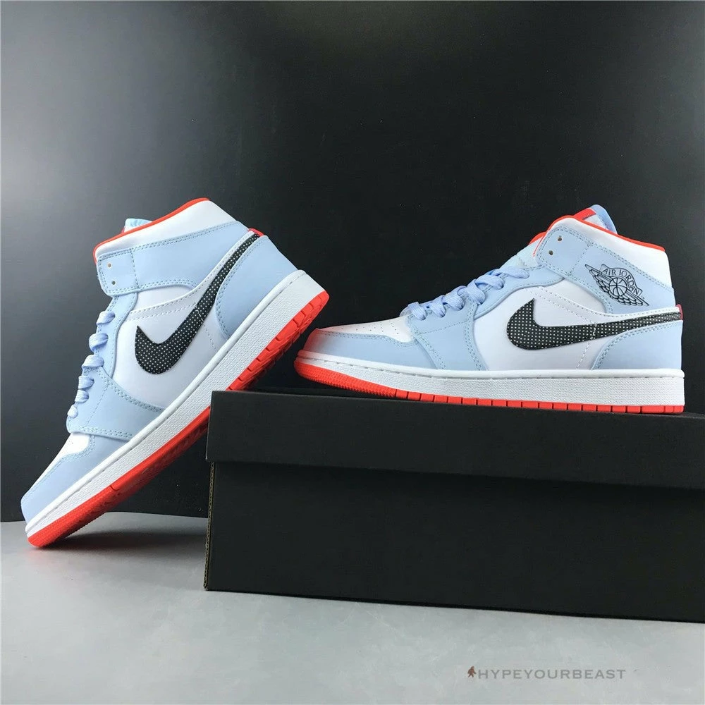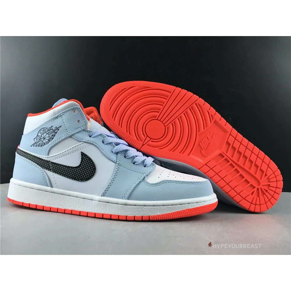 Air Jordan 1 Mid Half Blue has a simple but awesome colorway of half blue, black, white, and red. Its main highlight is its black Nike Swoosh with white polka dots. It gives extra spice to the clean white bases and half blue overlays on the toe cap, laces, ankle, and heel. To further make the sneakers interesting, Air Jordan 1 Mid Half Blue Polka Dot Swoosh brings out red outsoles. Own a pair of these shoes and experience both the cushy feels and unique look on your feet.