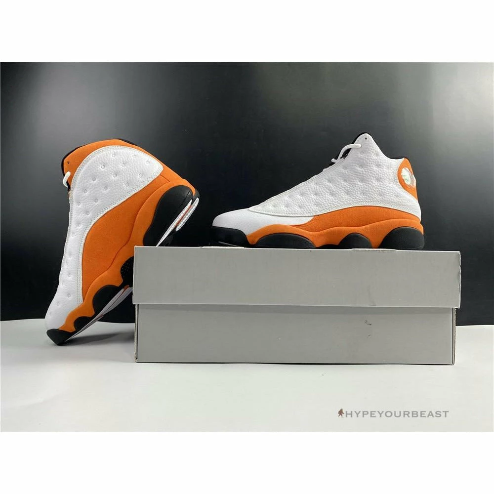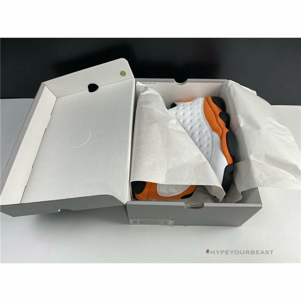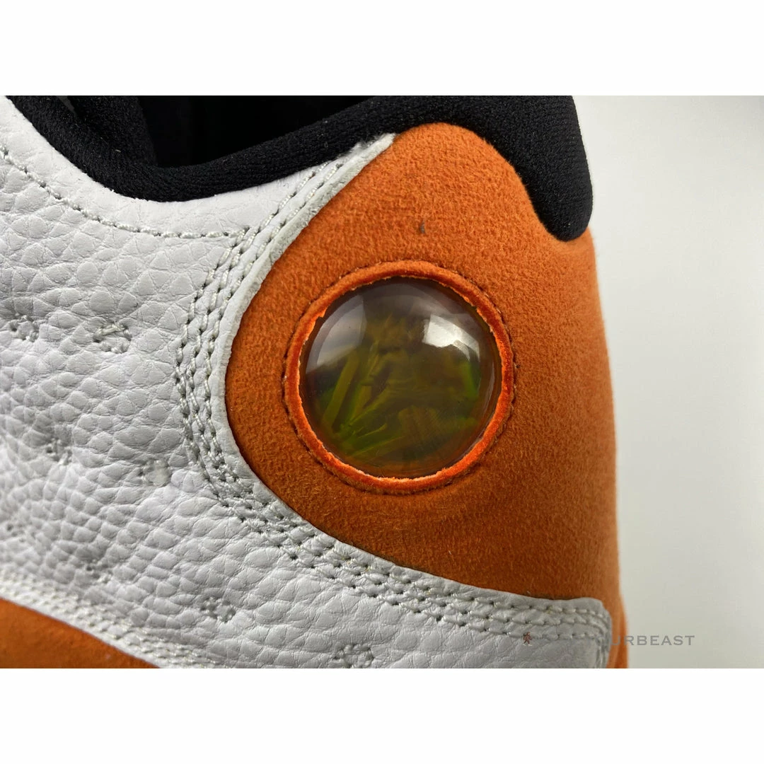 Bringing back the “ Air Jordan 1 Shattered Backboard” colorway is the main feature of Air Jordan 13 Retro Starfish as it also owns white and orange tones. It only differs from the styling, accenting, and overall construction of the sneakers. Air Jordan 13 Retro Starfish showcases white tumbled leather as the bases with orange suede overlays on the heel, mudguard, and midsoles. Completing the Air Jordan 13 classic features are the extra holographic eye on the lateral ankle, Jumpman logo on the tongue, and panther-paw on the black rubber outsoles. Claiming one of these sneakers stands your feet from the ground!