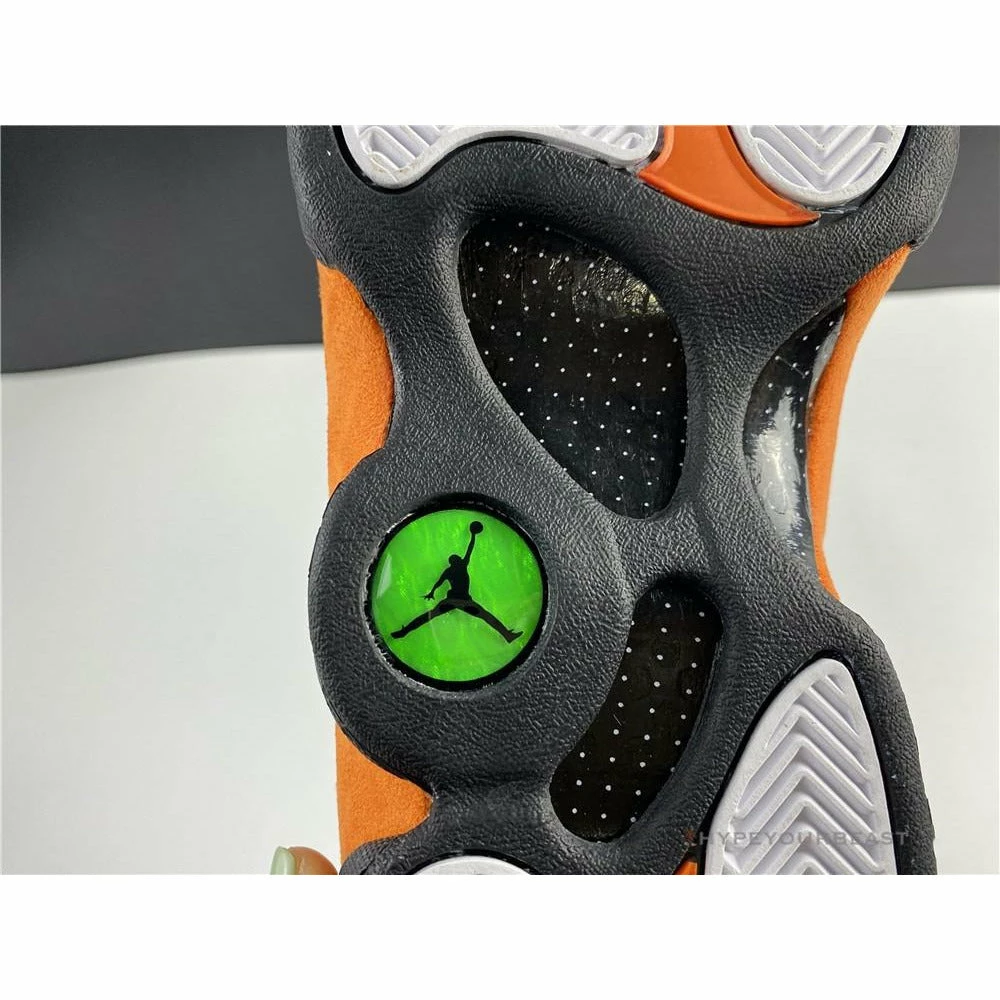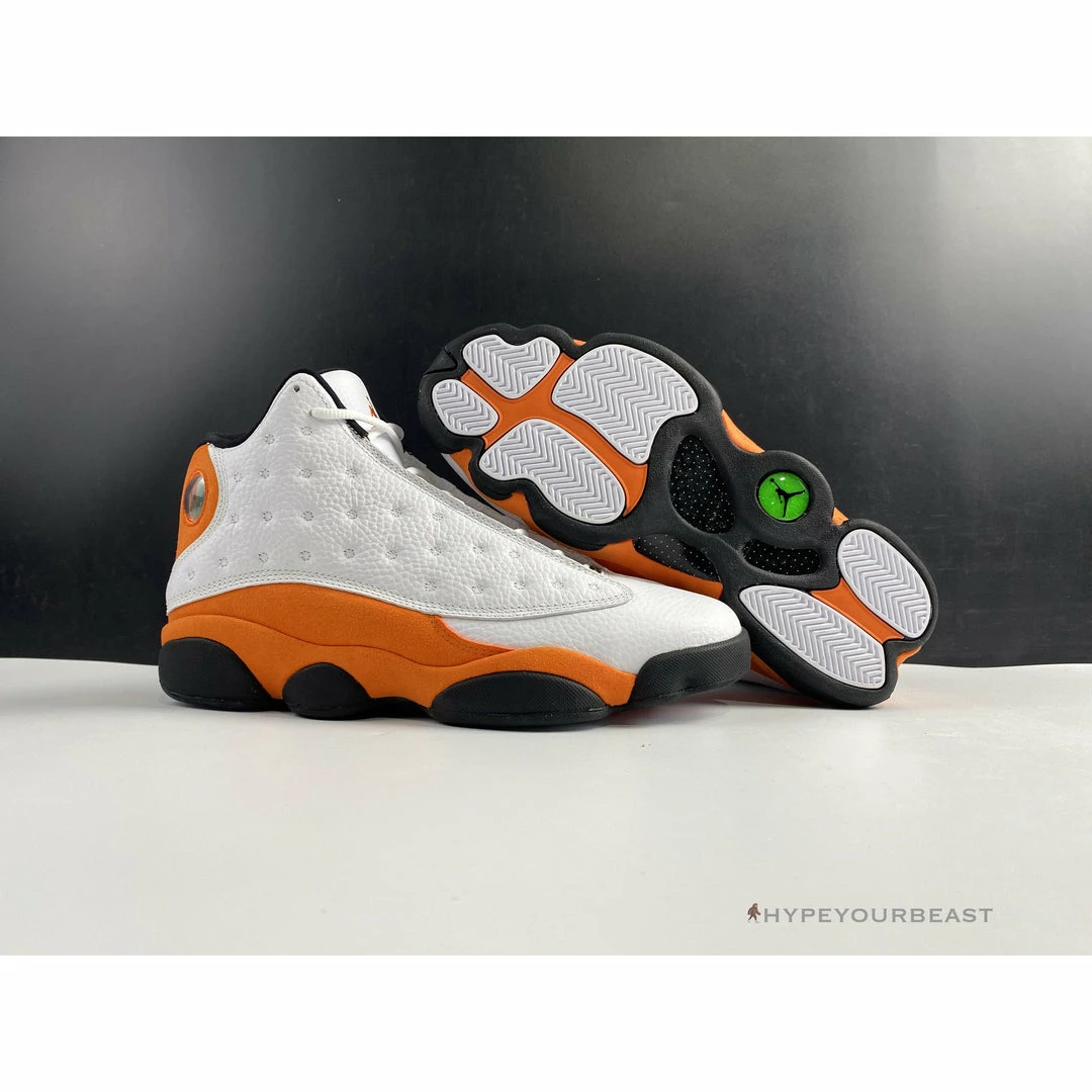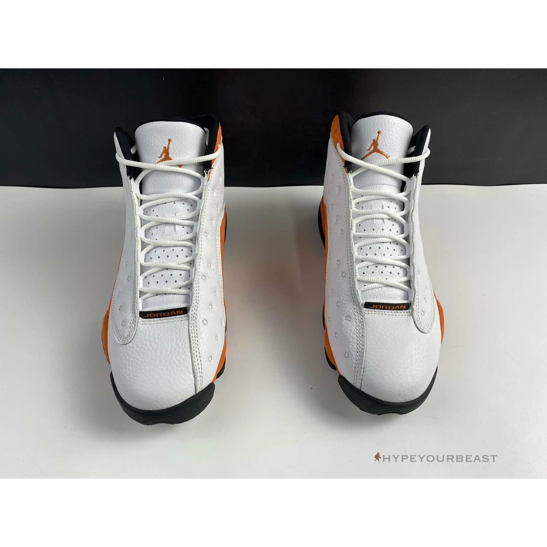 Bringing back the “ Air Jordan 1 Shattered Backboard” colorway is the main feature of Air Jordan 13 Retro Starfish as it also owns white and orange tones. It only differs from the styling, accenting, and overall construction of the sneakers. Air Jordan 13 Retro Starfish showcases white tumbled leather as the bases with orange suede overlays on the heel, mudguard, and midsoles. Completing the Air Jordan 13 classic features are the extra holographic eye on the lateral ankle, Jumpman logo on the tongue, and panther-paw on the black rubber outsoles. Claiming one of these sneakers stands your feet from the ground!