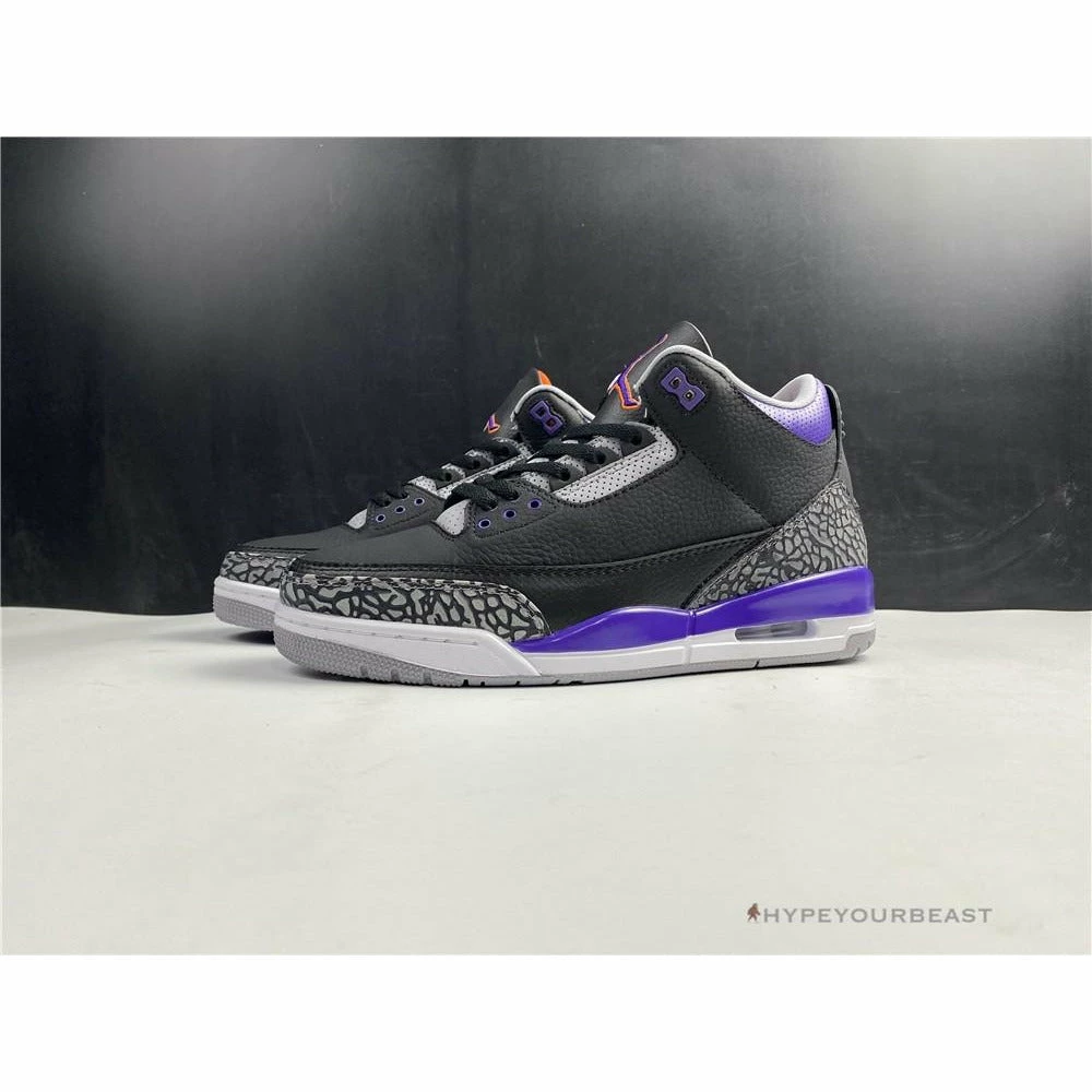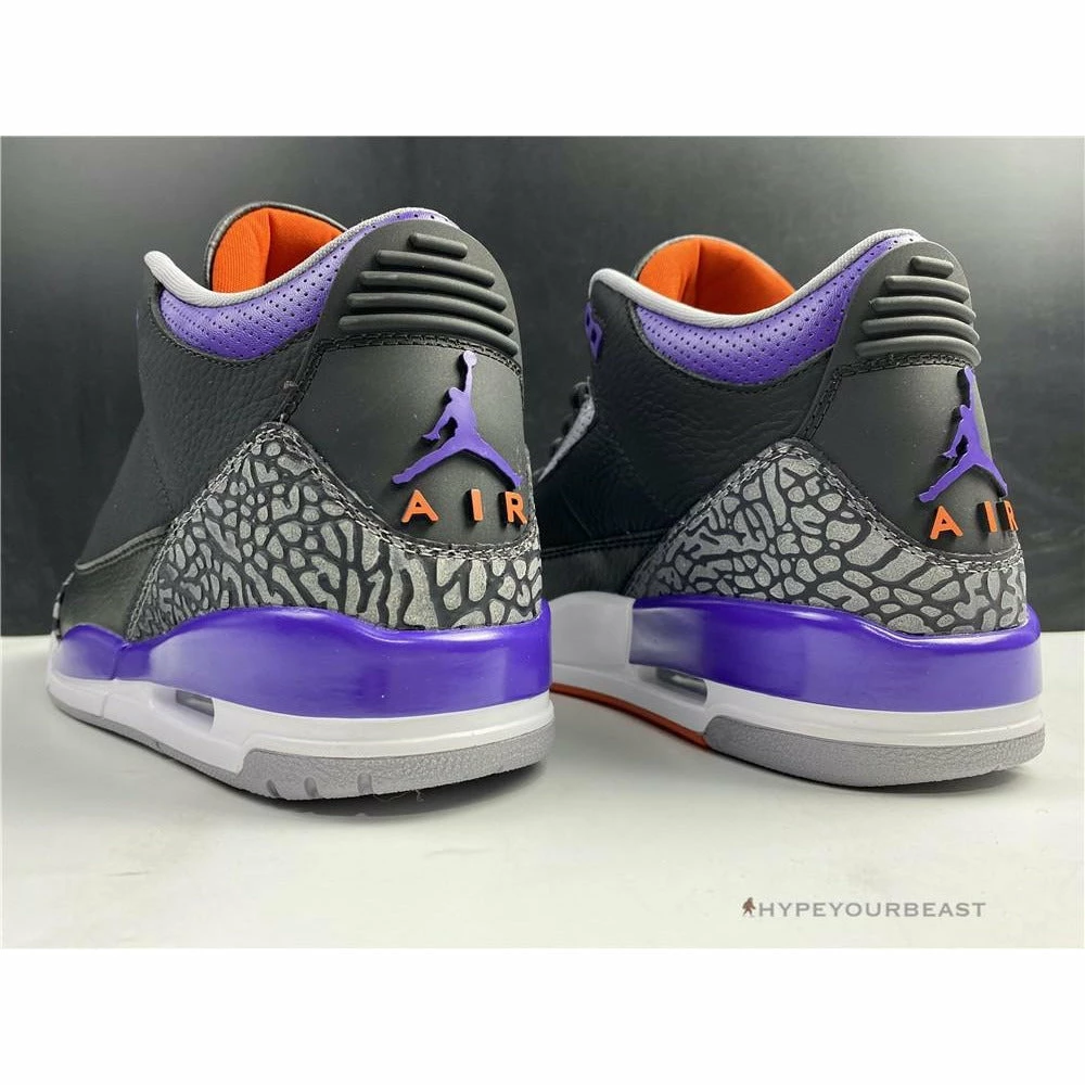 Air Jordan 3 ‘Court Purple Black Cement’ showcases intense black bases with purple and grey cement overlays. The sneakers have black leather upper construction with grey cement accents on the forefoot and mudguard sides. Other than that, an iconic purple Jumpman logo with orange embroidery is placed on the tongue tab on the pair. The shoes are completed with a purple Jumpman with an orange AIR label. Moreover, the sneakers also feature a visible Air technology on the white midsole and grey rubber outsoles.