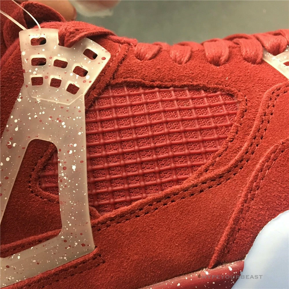 Air Jordan 4 Retro Oklahoma Sooners showcases classy Claret Red colorways which gives an excellent look on your feet. The footwear is constructed from suede Claret Red upper with red netted panels and other incredible overlays of red with white paint spots. These white paint-like sprinkles are seen on the eyelets, mudguard, and even at the heel tab. Air Jordan 4 Oklahoma Sooners PE also owns sleeking white midsoles with visible Air sole technology. Moreover, you surely need to possess this footwear due to its captivating clear rubber outsoles.