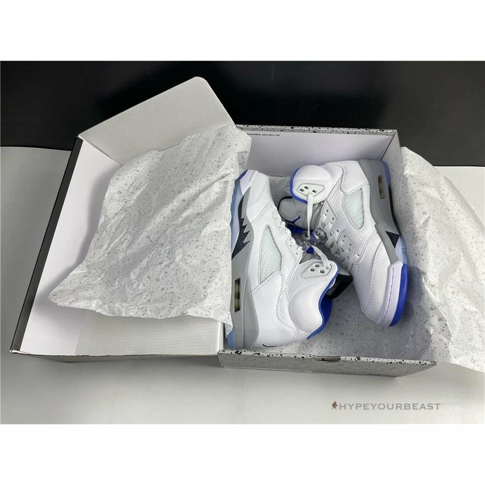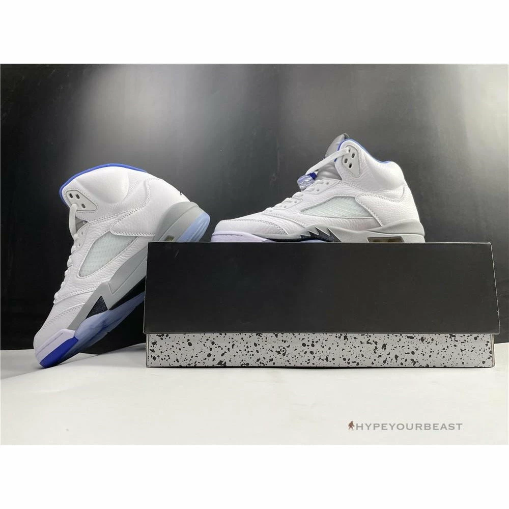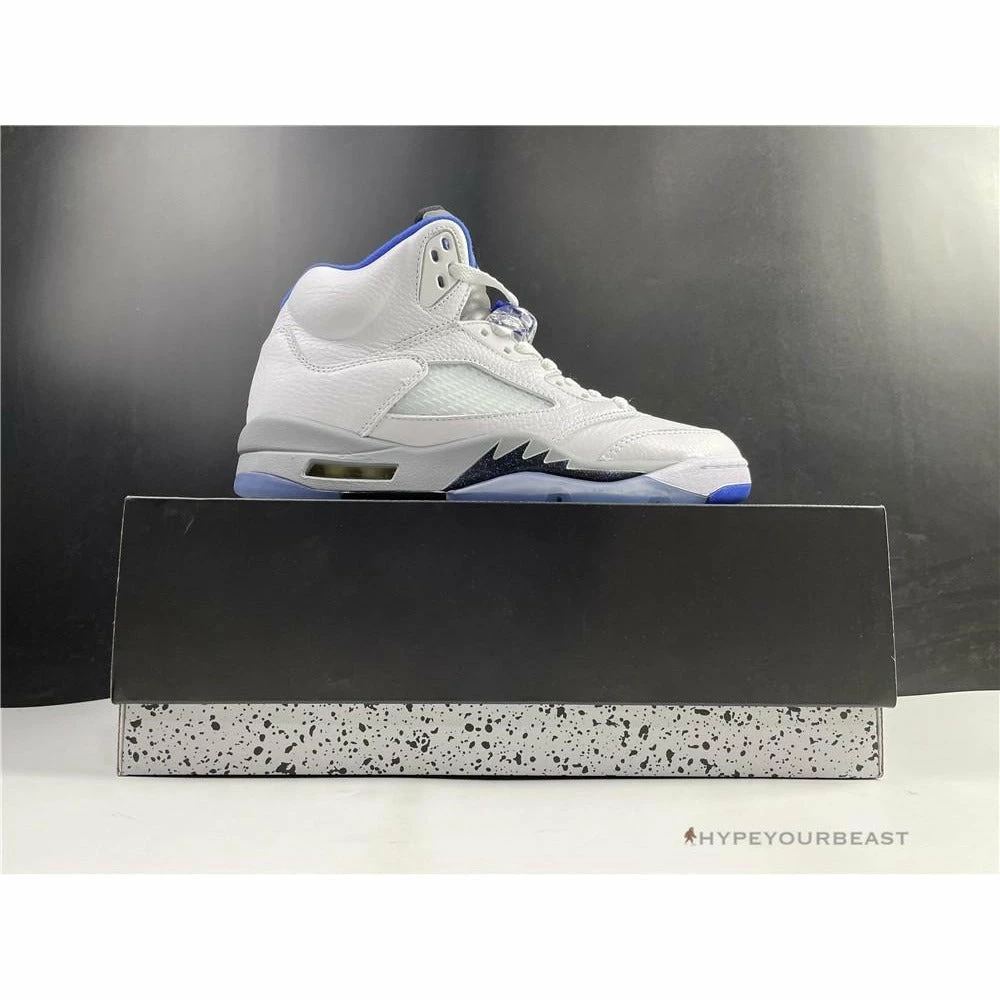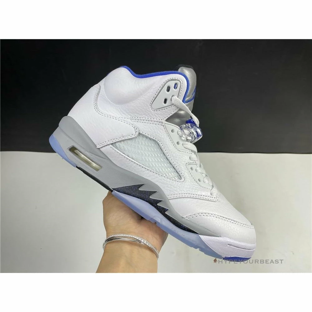 White sneakers with powder blue accents are the primary highlights of Air Jordan 5 Retro Stealth 2. This footwear uses white leather upper bases on its appearance. It also uses an impressive shape of collars with huge tongue tabs. These mid-top kicks also use pale grey touch on the tongue tab and midsoles with visible Air sole technology. Besides that, these sneakers also bring you the iconic Air Jordan 5 shark tooth details. To complete the overall look, Air Jordan 5 Retro Stealth 2 presents the translucent outsoles with a powder blue Jumpman.