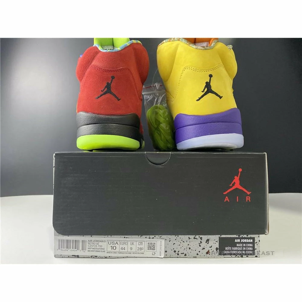 Air Jordan 5 Retro SE ‘What The’ gains lots of attention due to its yellow-colored right shoe and red color-left shoe. These sneakers bring a bold and brave combination of these two colors as it also joins the 30 years celebration of the brand. Air Jordan released Air Jordan 5 ‘What The’ with great construction of suede upper with additional accenting of the brand label. The yellow right shoe has Tokyo colorways, while the red left shoe has the Raging Bull shades. Be one of the wearers of these eye-catching sneakers now!
