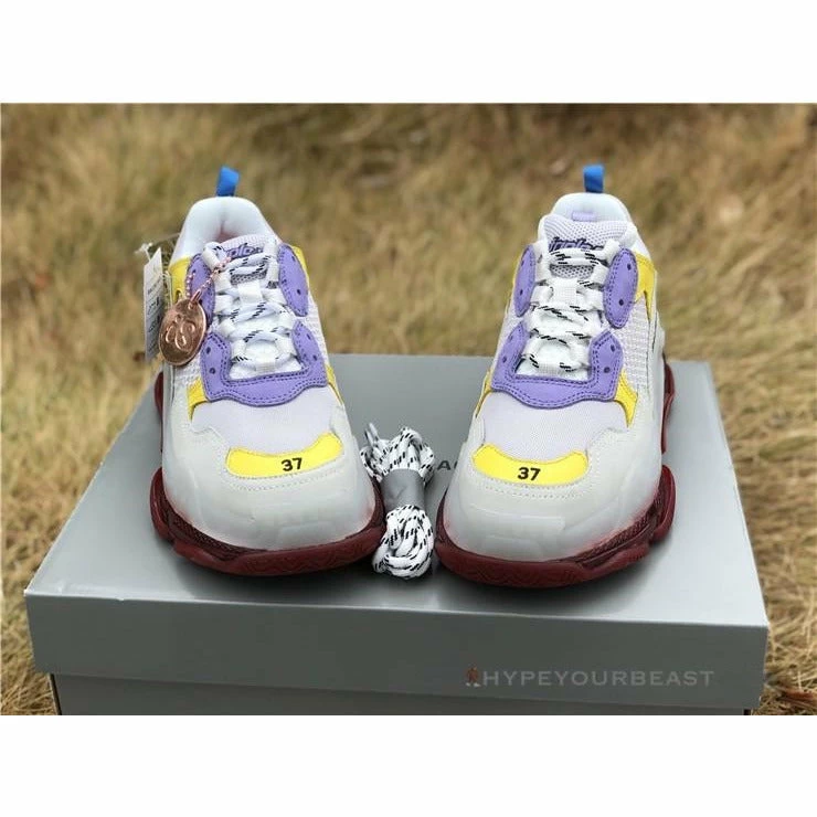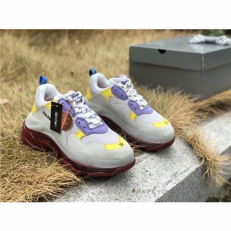 A remarkable pair of sneakers with purple, yellow, white, and red colorways is now seen on the Balenciaga Triple S White Purple Yellow. If you prefer multicolor footwear, a pair of sneakers with grey nonleather upper bases and purple and yellow accents are perfect for you. The sneakers also include triple sole features in a red tone which made them more fascinating on your feet. Wearing Balenciaga Triple S White Purple Yellow gives you a chance to show a tremendous style with your outfit.