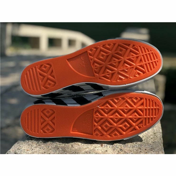 A fascinating pair of Converse Chuck 70 Hi Off White brings out a Converse Chuck 70 Hi Off White Mens clear white pair. It channels the high-top white upper sneakers made from canvas Converse Chuck 70 Hi Off White sneakers never left behind the classic Off-White signature text on its medial sides while it reveals the Converse logo above it. The sneakers also showcase the “SHOELACES” prints on the laces and a bright orange zip tie. It also highlights the terrific black rubber stripes on its vulcanized sole suitable for the bright orange rubber outsoles. The sneakers give you a chance to lighten up white sneakers with orange accents.